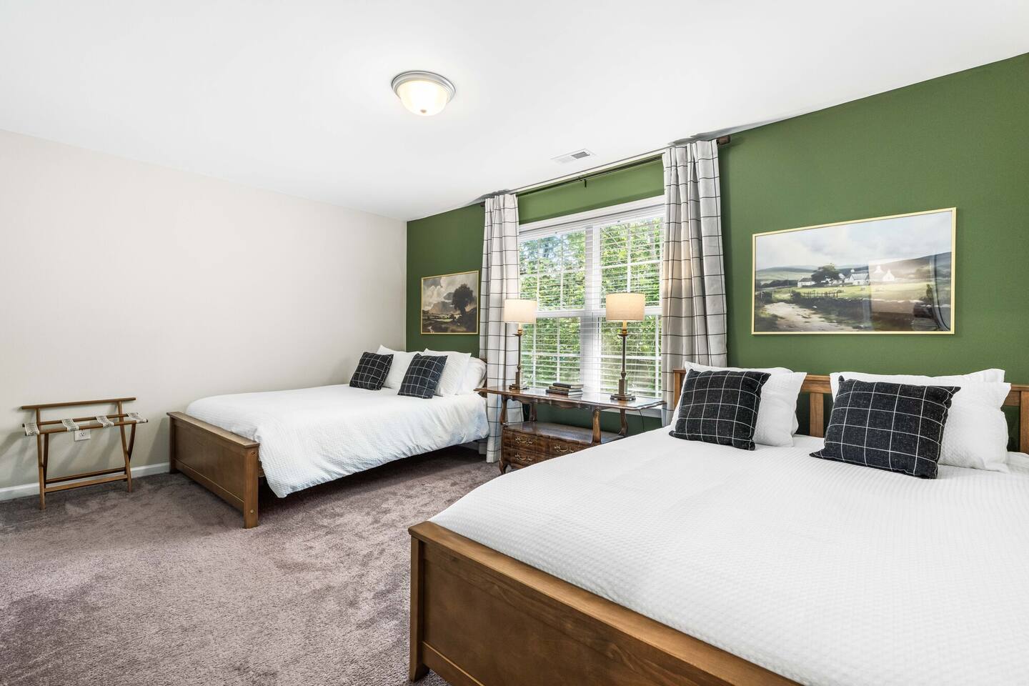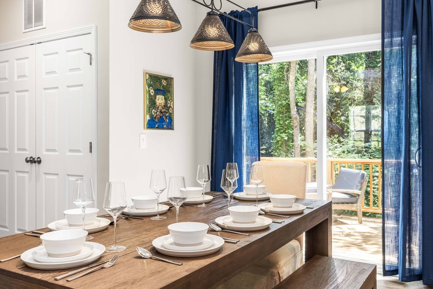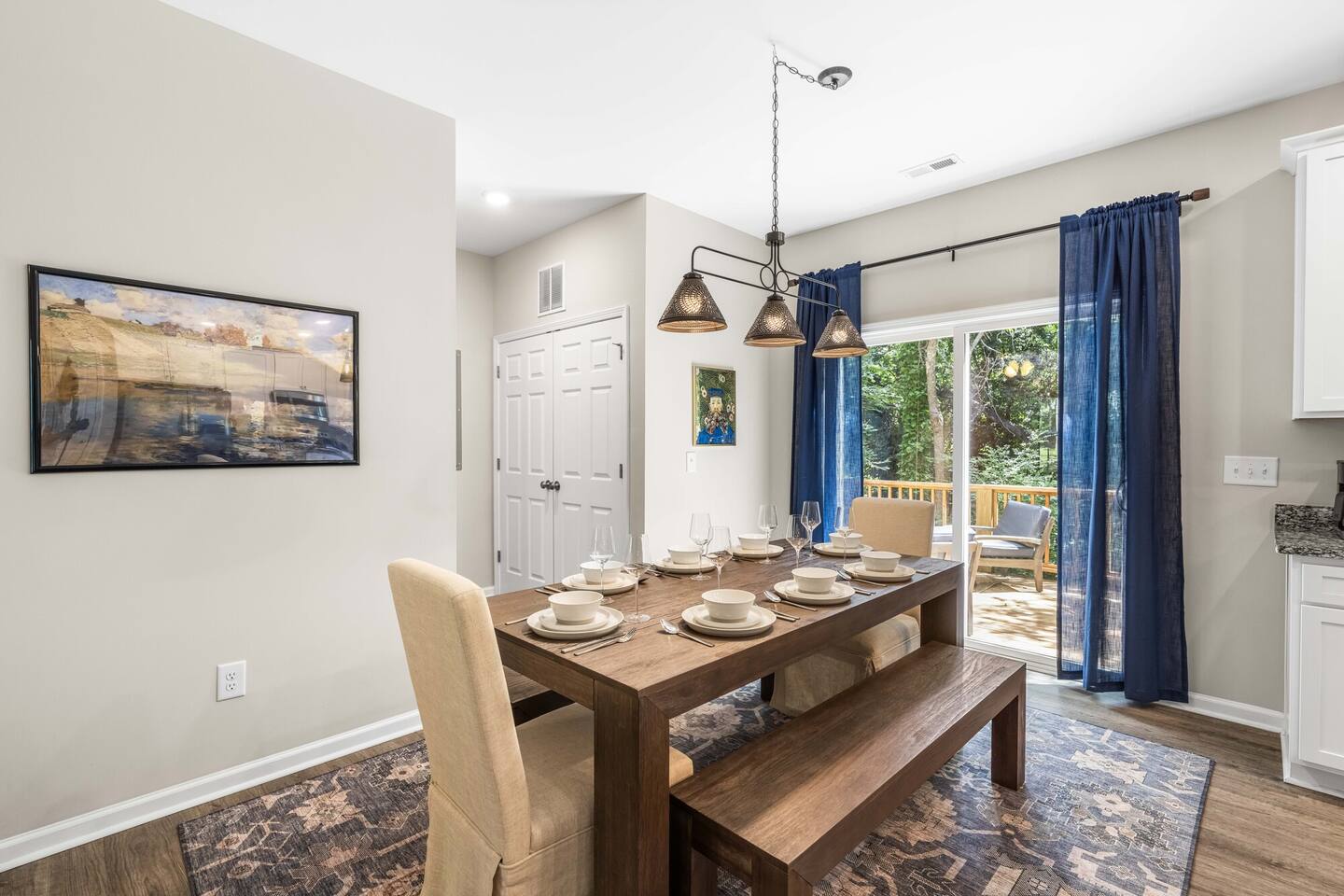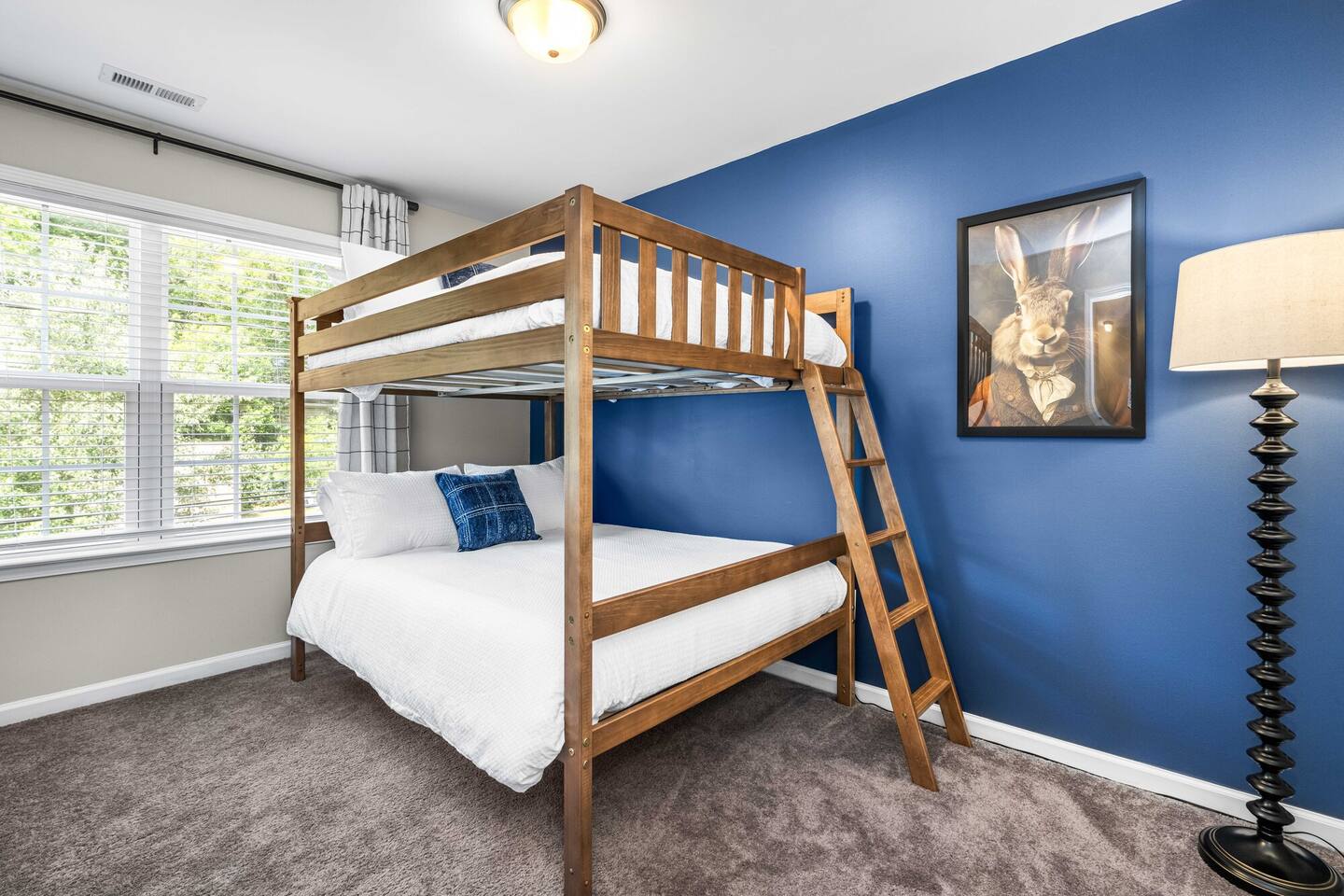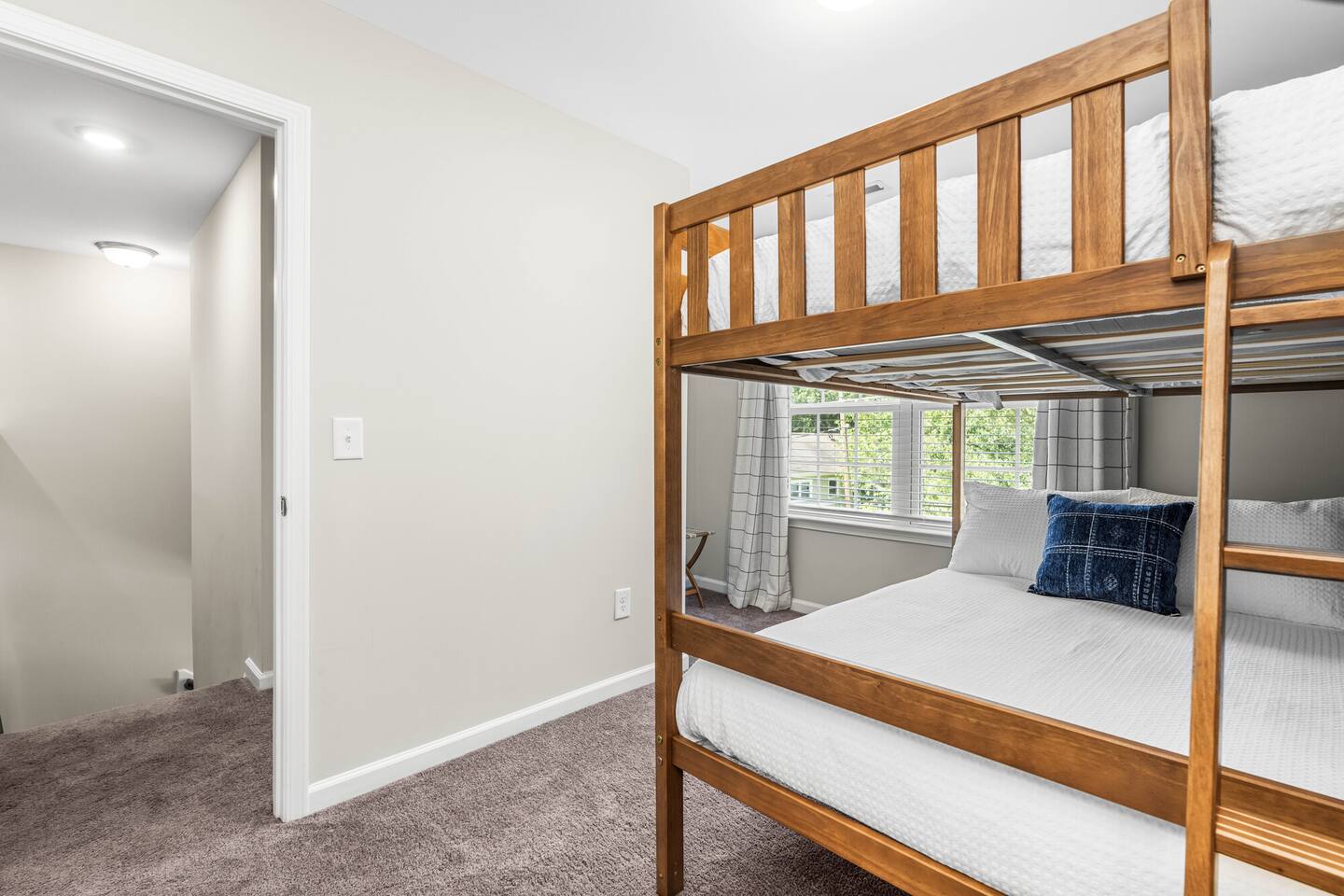Upstairs, unwind in five comfortable bedrooms: Primary Suite: King bed + workspace + ensuite bath with tub Bedrooms 2 & 3: Queen beds Bedrooms 4: 2x Queen beds Bedroom 5: Full under Twin bunkbed — ideal for kids or extra guests Every bed is outfitted with premium linens and hotel-grade comfort. 🌿 Outdoor Spaces Step onto your balcony deck to grill, dine, or relax with treetop views. In the fenced backyard, enjoy cornhole and lawn games under the lights — the perfect end to a day in Durham. 💻 Tech & Amenities ✔ FAST Wi-Fi for work or streaming ✔ Smart TVs in living area and primary bedroom ✔ Yale smart lock for easy self check-in ✔ Central A/C & heating ✔ BBQ grill & outdoor dining set ✔ Washer & dryer in unit 🌇 Location Highlights Prime central location — walk or drive to Durham’s best: 🚶♂️ Ninth Street District (1.5 mi) – shops, cafés & local vibe 🎭 DPAC (1 mi) – Broadway & concerts ⚾ Durham Bulls Ballpark (0.8 mi) 🎓 Duke University & Gardens (1.3 mi) 🍽️ Downtown restaurants & breweries (< 10 min) Quiet neighborhood + quick access = the best of both worlds. 💬 Guest Favorites “The space was immaculate and huge — perfect for our family visit to Duke.” “Loved the BBQ deck and backyard games after a day downtown.” “Super easy check-in and amazing communication from the host.” 🔑 Guest Access Guests have exclusive use of the entire home, patio, and backyard. Entry via smart lock self check-in. Free parking in driveway and on street. 🧹 Other Things to Note Professionally cleaned between each stay for hotel-quality freshness. No parties or smoking. 💼 Ideal For ✅ Duke families & medical professionals ✅ Corporate relocations or traveling teams ✅ Wedding groups & extended family stays ✅ Long weekend getaways & durations up to 30 days