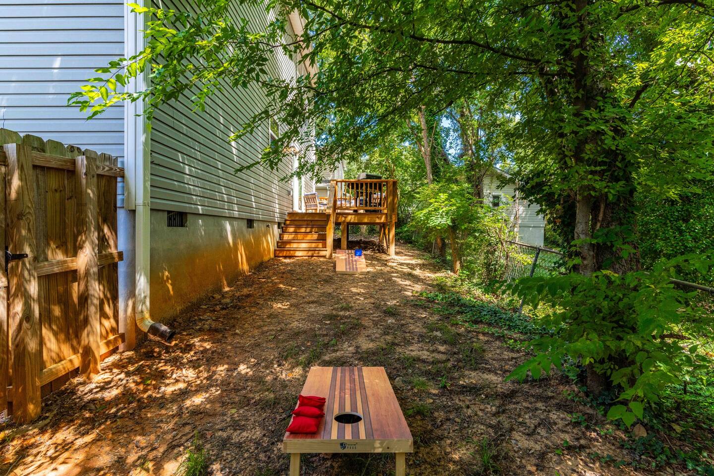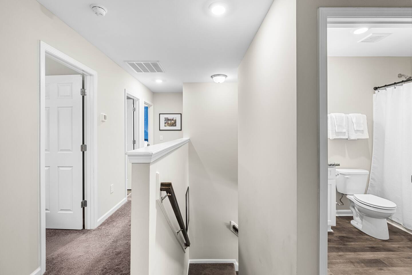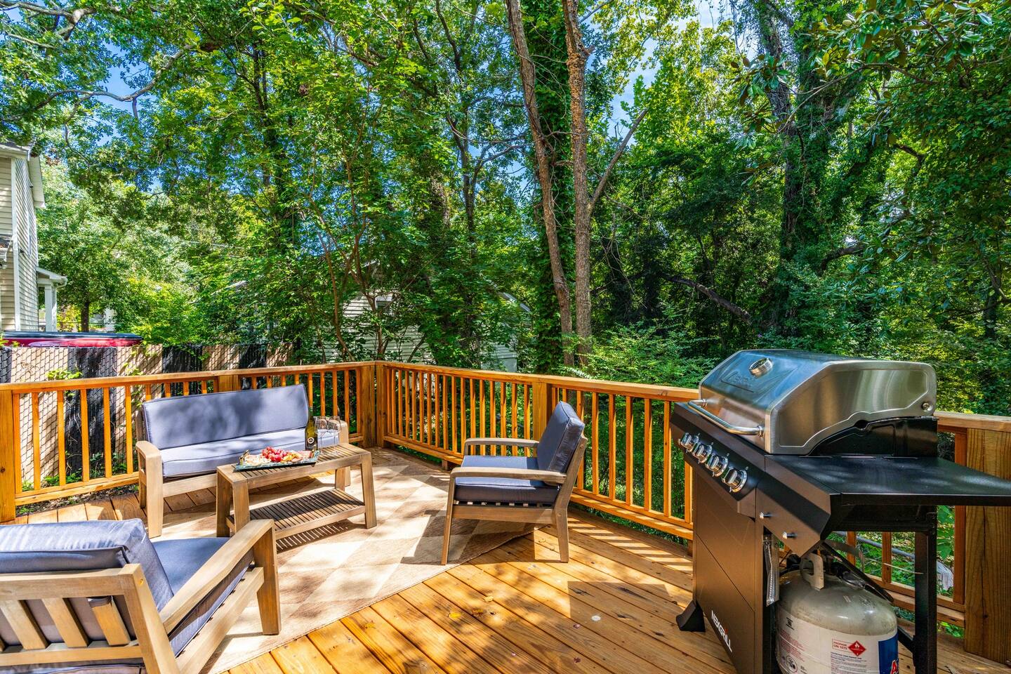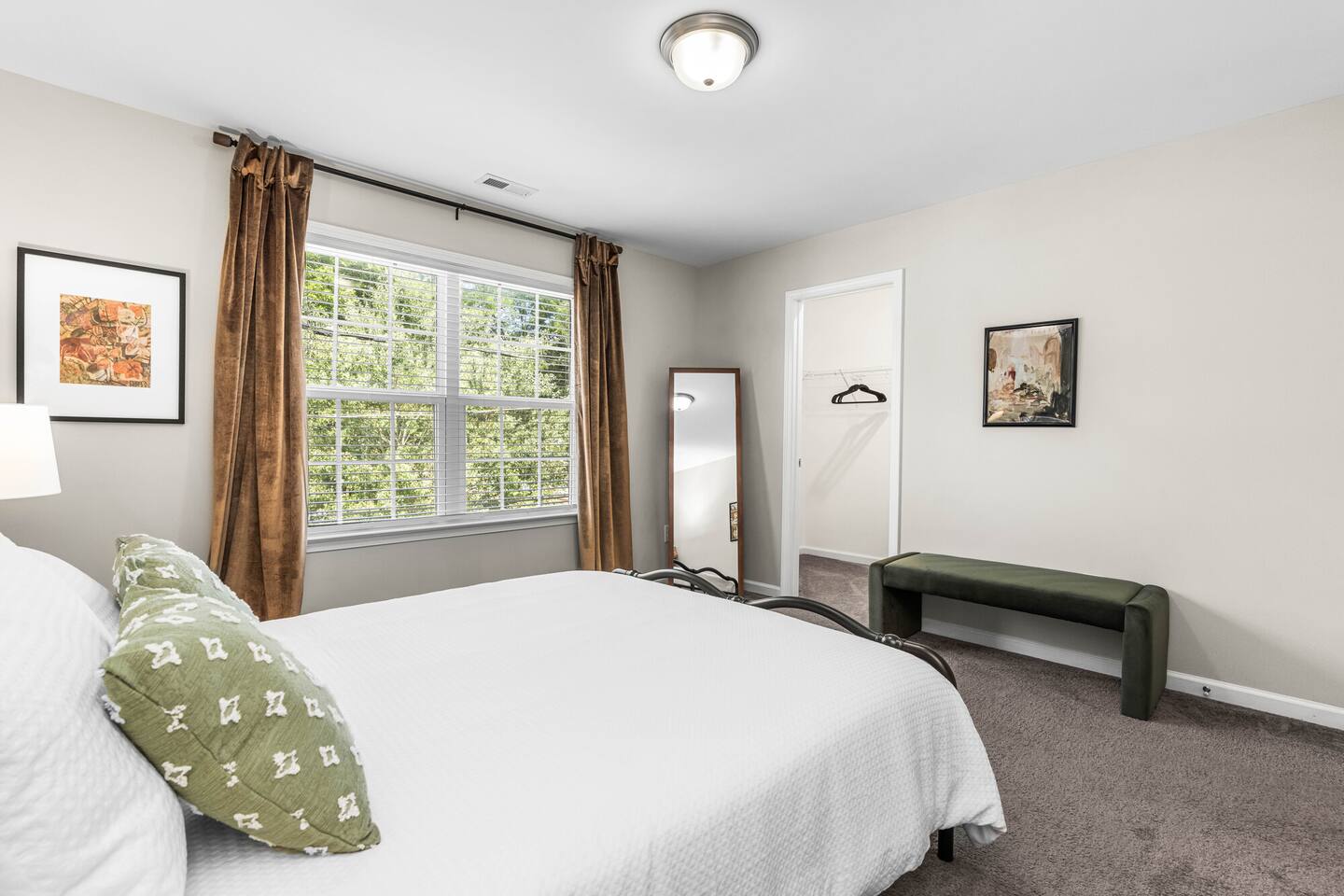 Upstairs, unwind in five comfortable bedrooms: Primary Suite: King bed + workspace + ensuite bath with tub Bedrooms 2 & 3: Queen beds Bedrooms 4: 2x Queen beds Bedroom 5: Full under Twin bunkbed — ideal for kids or extra guests Every bed is outfitted with premium linens and hotel-grade comfort. 🌿 Outdoor Spaces Step onto your balcony deck to grill, dine, or relax with treetop views. In the fenced backyard, enjoy cornhole and lawn games under the lights — the perfect end to a day in Durham. 💻 Tech & Amenities ✔ FAST Wi-Fi for work or streaming ✔ Smart TVs in living area and primary bedroom ✔ Yale smart lock for easy self check-in ✔ Central A/C & heating ✔ BBQ grill & outdoor dining set ✔ Washer & dryer in unit 🌇 Location Highlights Prime central location — walk or drive to Durham’s best: 🚶♂️ Ninth Street District (1.5 mi) – shops, cafés & local vibe 🎭 DPAC (1 mi) – Broadway & concerts ⚾ Durham Bulls Ballpark (0.8 mi) 🎓 Duke University & Gardens (1.3 mi) 🍽️ Downtown restaurants & breweries (< 10 min) Quiet neighborhood + quick access = the best of both worlds. 💬 Guest Favorites “The space was immaculate and huge — perfect for our family visit to Duke.” “Loved the BBQ deck and backyard games after a day downtown.” “Super easy check-in and amazing communication from the host.” 🔑 Guest Access Guests have exclusive use of the entire home, patio, and backyard. Entry via smart lock self check-in. Free parking in driveway and on street. 🧹 Other Things to Note Professionally cleaned between each stay for hotel-quality freshness. No parties or smoking. 💼 Ideal For ✅ Duke families & medical professionals ✅ Corporate relocations or traveling teams ✅ Wedding groups & extended family stays ✅ Long weekend getaways & durations up to 30 days
