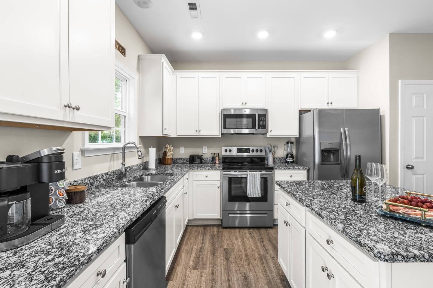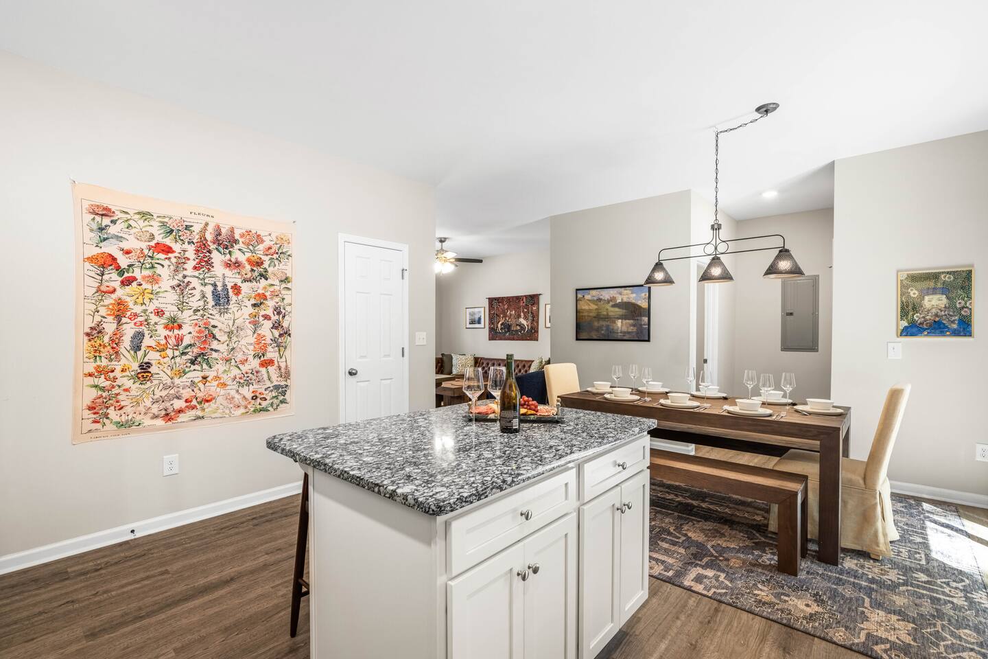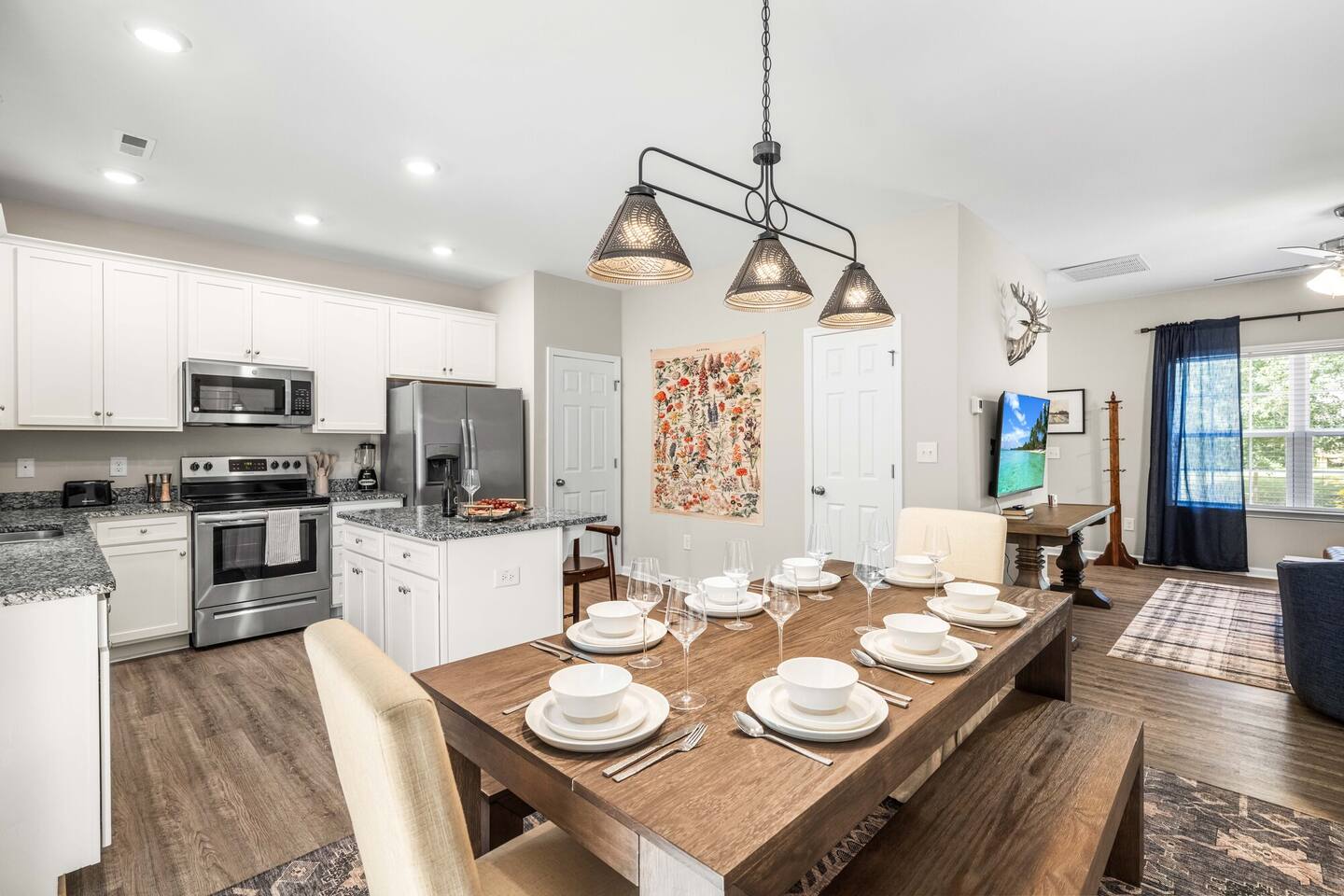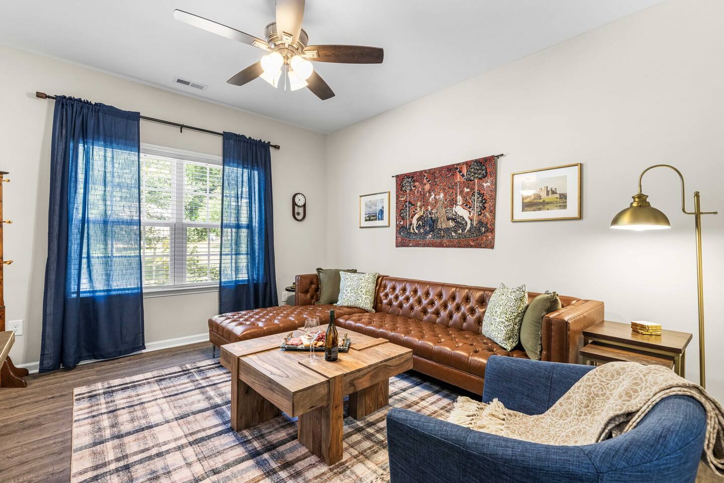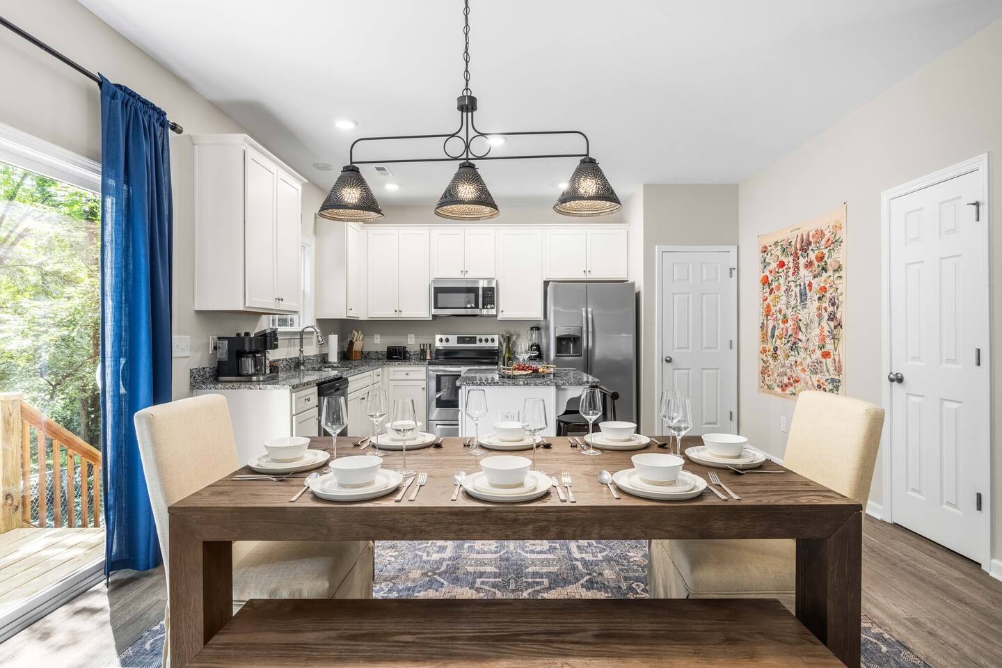Welcome to The Rock House Retreat — a bright, modern 5-bedroom, 3.5-bath luxury home offering space, style, and comfort just minutes from Duke University, DPAC, and the Ninth Street District. Perfect for families, traveling professionals, or groups visiting Durham for work, sports, or leisure. Enjoy an open-concept living area with a leather sectional, large Smart TV, and plenty of natural light. The fully equipped chef’s kitchen features stainless steel appliances and an island w/ bar seating.