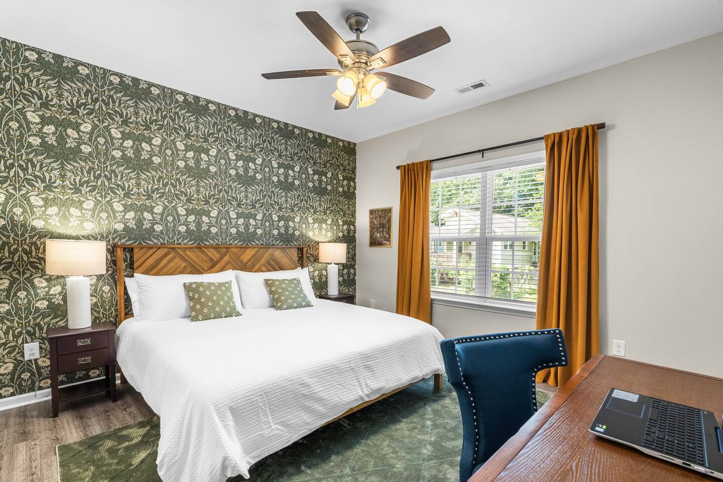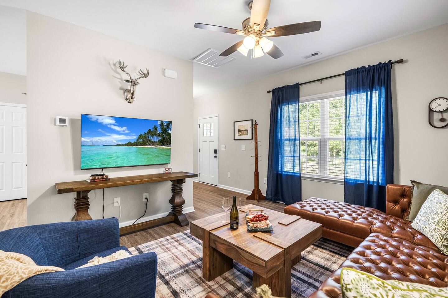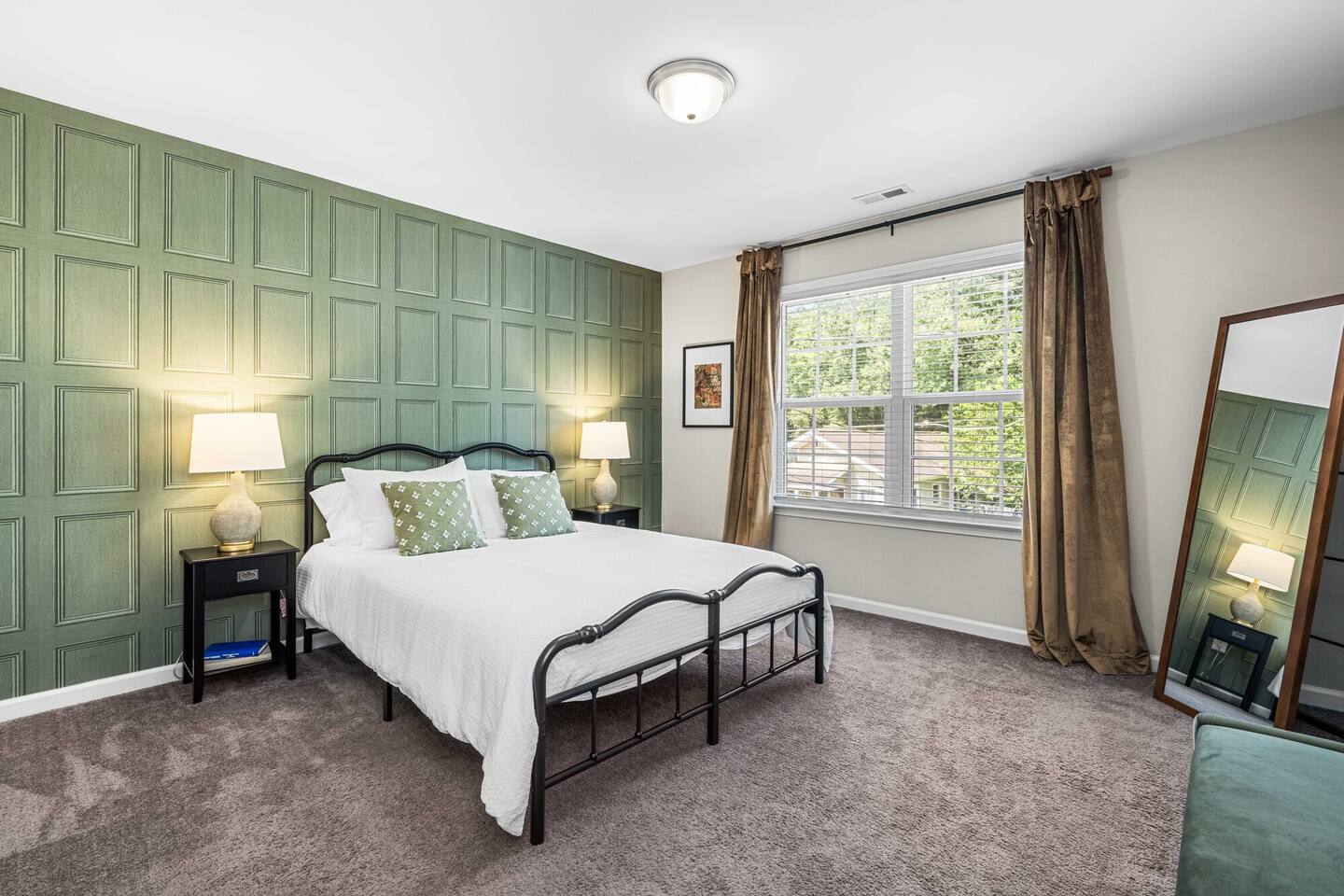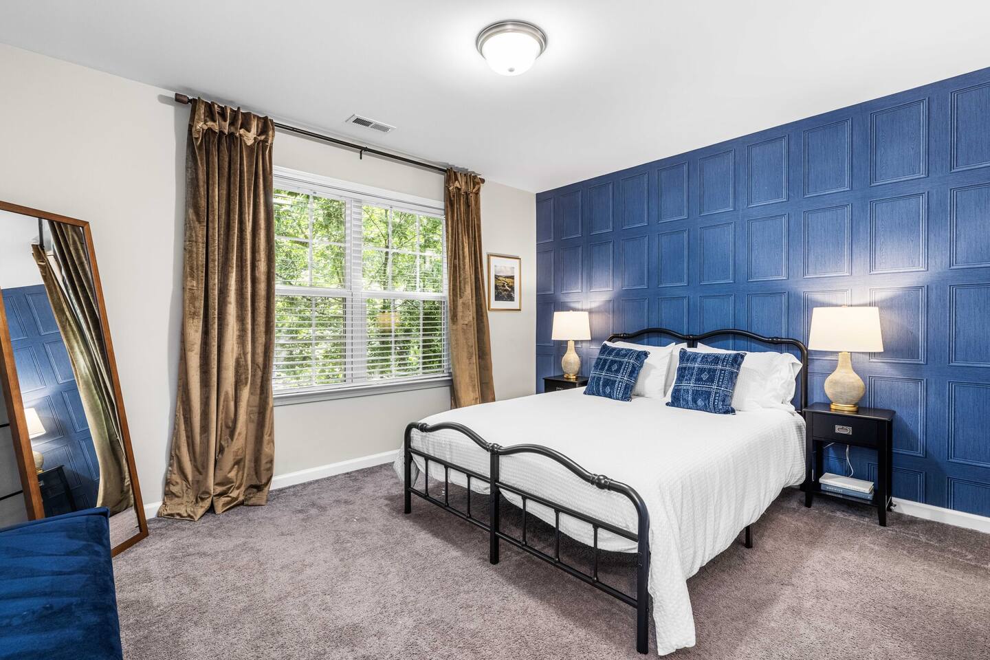 Welcome to The Rock House Retreat — a bright, modern 5-bedroom, 3.5-bath luxury home offering space, style, and comfort just minutes from Duke University, DPAC, and the Ninth Street District. Perfect for families, traveling professionals, or groups visiting Durham for work, sports, or leisure. Enjoy an open-concept living area with a leather sectional, large Smart TV, and plenty of natural light. The fully equipped chef’s kitchen features stainless steel appliances and an island w/ bar seating.