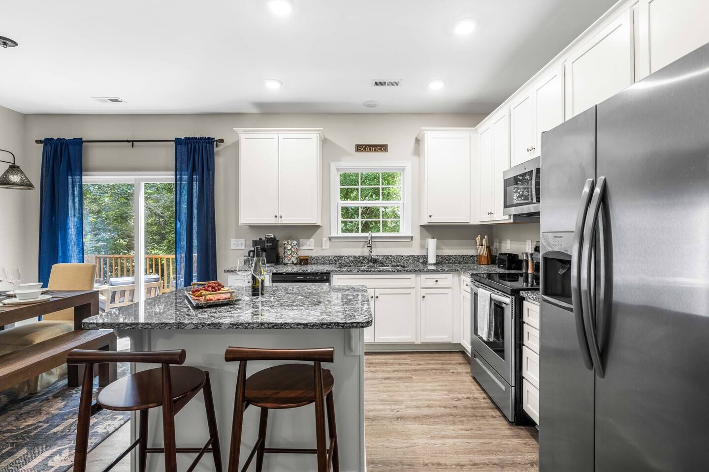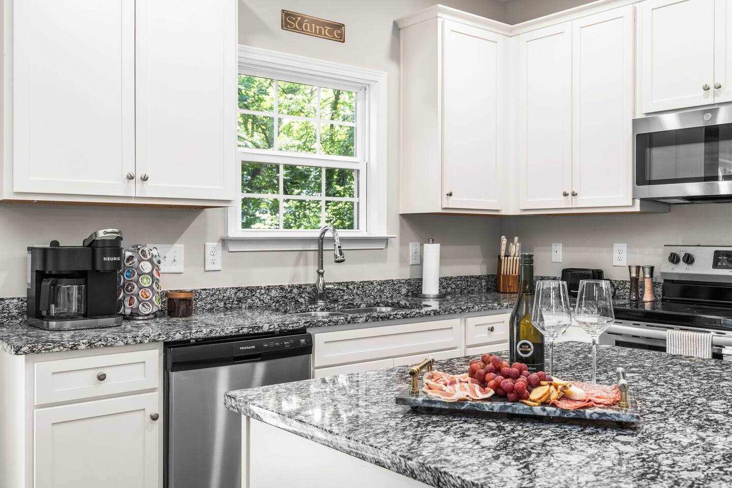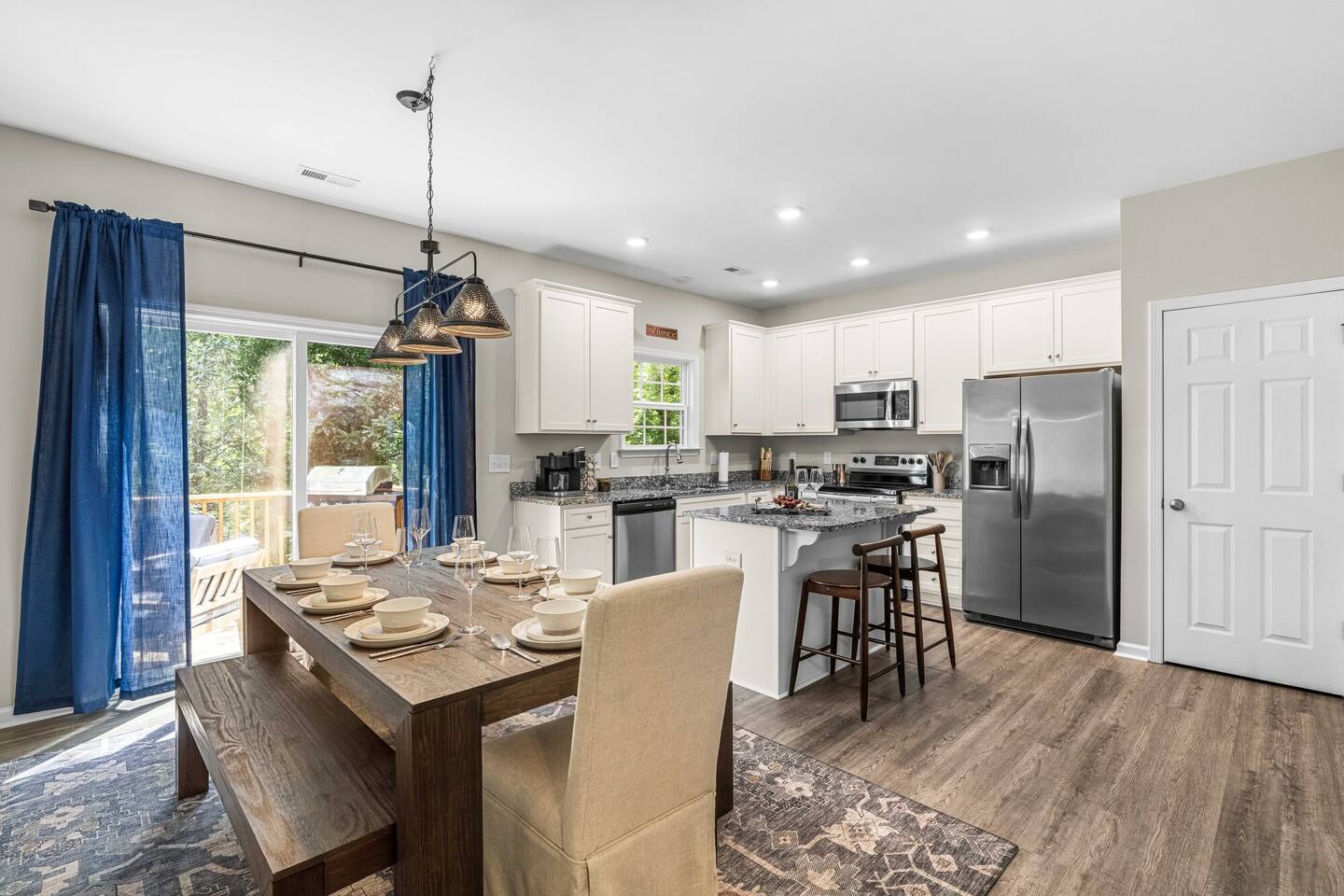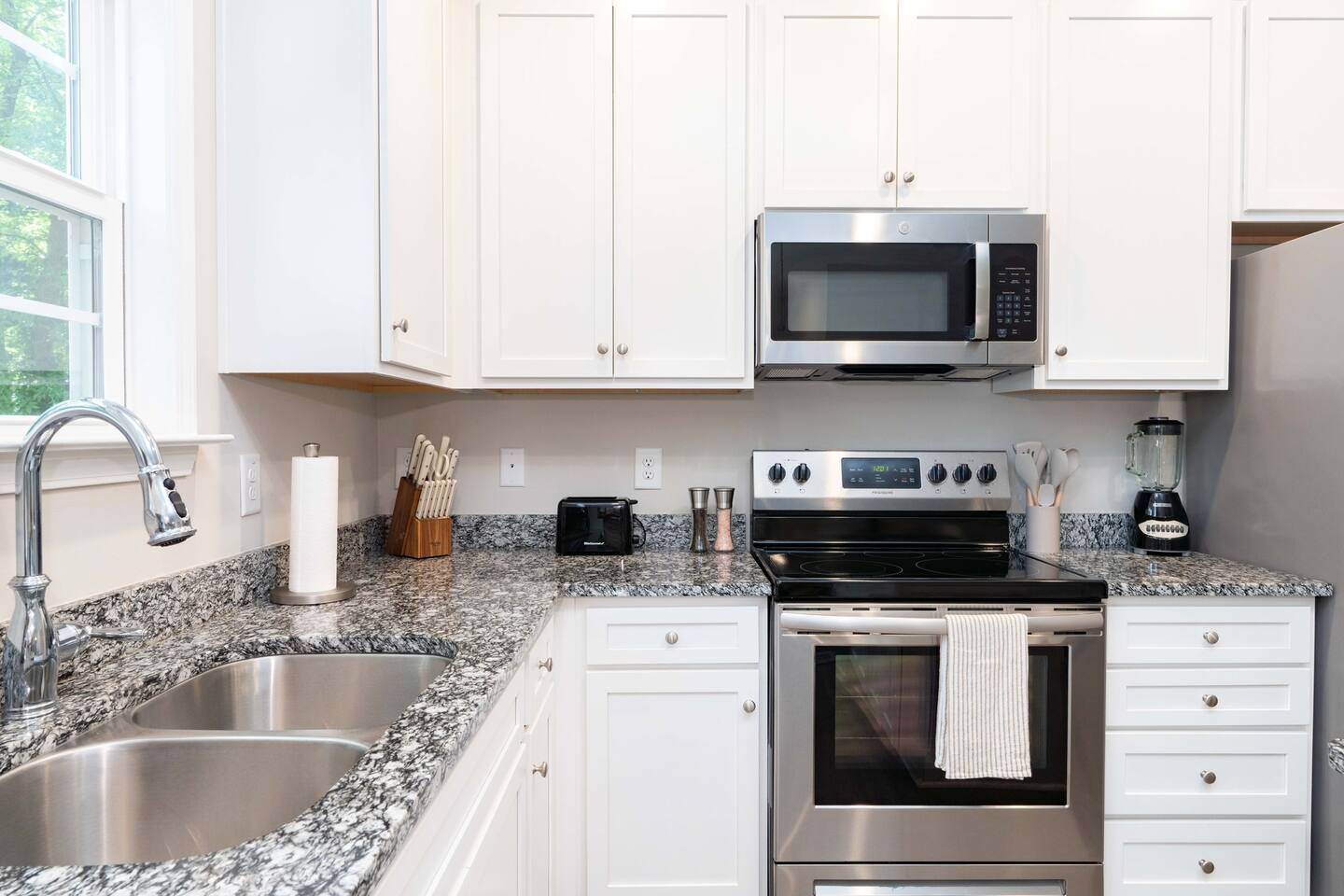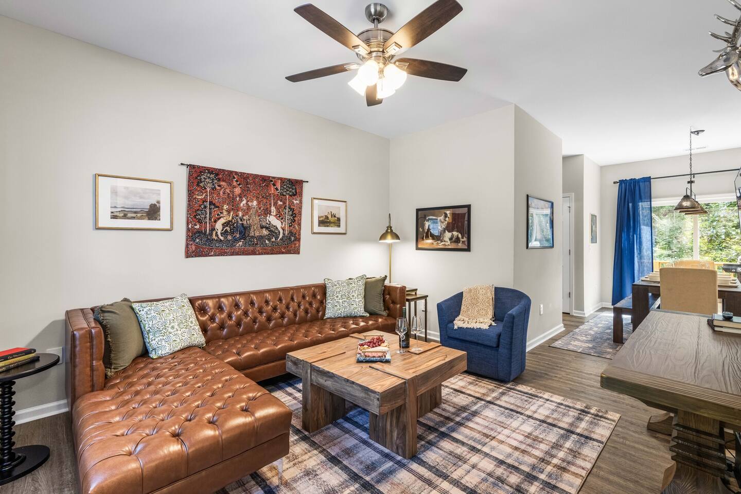 Welcome to The Rock House Retreat — a bright, modern 5-bedroom, 3.5-bath luxury home offering space, style, and comfort just minutes from Duke University, DPAC, and the Ninth Street District. Perfect for families, traveling professionals, or groups visiting Durham for work, sports, or leisure. Enjoy an open-concept living area with a leather sectional, large Smart TV, and plenty of natural light. The fully equipped chef’s kitchen features stainless steel appliances and an island w/ bar seating.